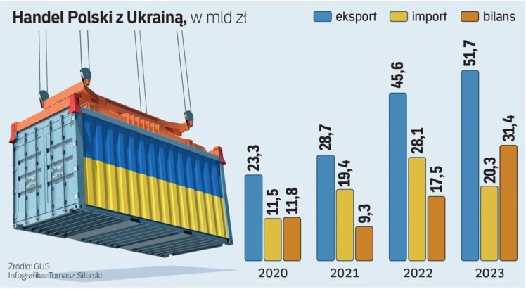 У 2023 році вартість польського експорту в Україну сягнула рекордних 51,7 млрд злотих ($13 млрд), тоді як імпорт становить лише 20,3 млрд злотих ($5,1 млрд).