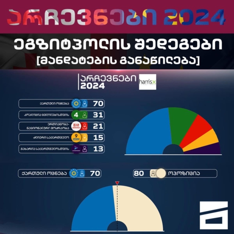 За даними каналу «Грузинська мрія» отримала 42% голосів, тоді як опозиційні партії — 48% («Єдність — Нацрух» — 13%, «Коаліція за зміни» — 18%, «Сильна Грузія» — 9%, «Гахарія — за Грузію» — 8%).