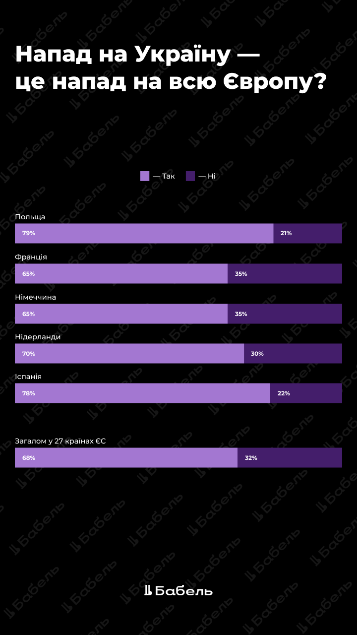 У середньому 68% жителів усіх 27 країн-членів Євросоюзу підтримують тезу, що напад росії на Україну означає напад на всю Європу. У Польщі таких аж 79%, а в Іспанії — 78%.