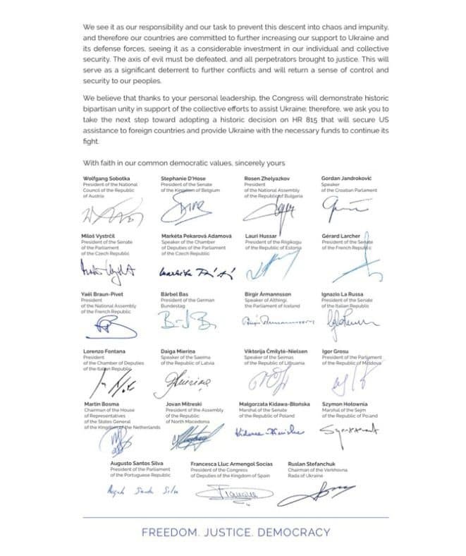 The speakers of 23 parliaments and the head of the European Parliament Roberta Metsola sent an open letter to the speaker of the House of Representatives of the US Congress Mike Johnson. They are asking for consideration of a draft law on the allocation of $60 billion in aid to Ukraine.