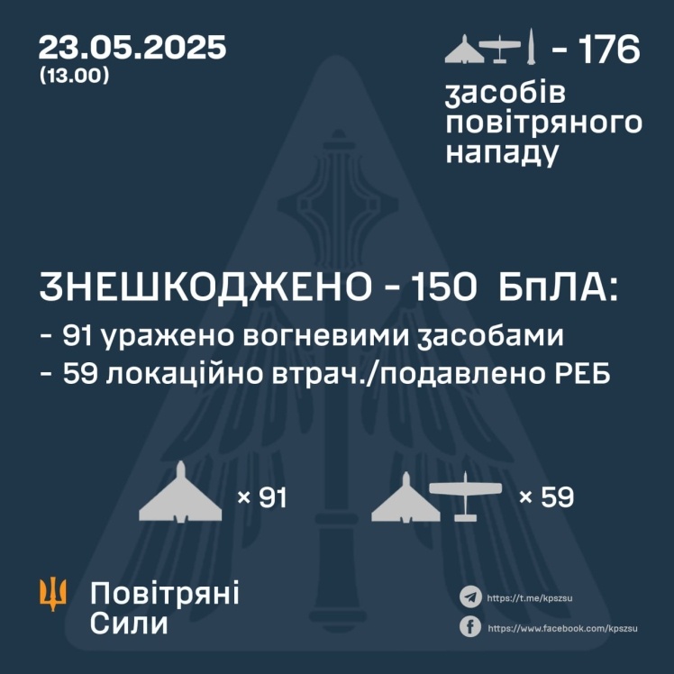 Ukrainian air defense neutralized 150 enemy drones in the east, west, north, south and center of the country. Of these, 91 were shot down by fire weapons, and 59 were lost or suppressed by electronic warfare (EW) (without negative consequences). The air attack was repelled by aviation, anti-aircraft missile troops, electronic warfare and unmanned systems units, and mobile fire groups of the Defense Forces of Ukraine.