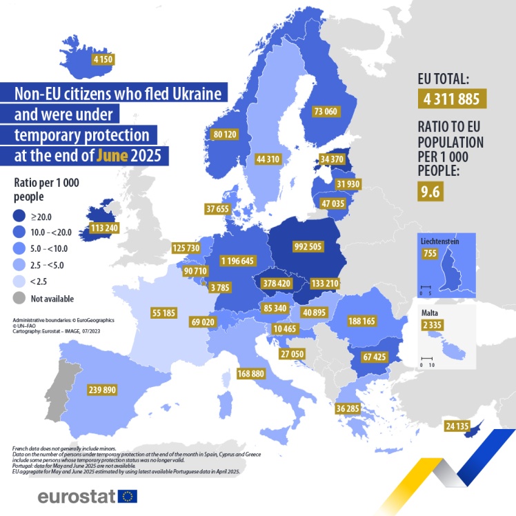 In June 2025, 32 940 Ukrainian citizens received temporary protection in the European Union. In total, 4.31 million Ukrainians were under its protection at the end of the month.