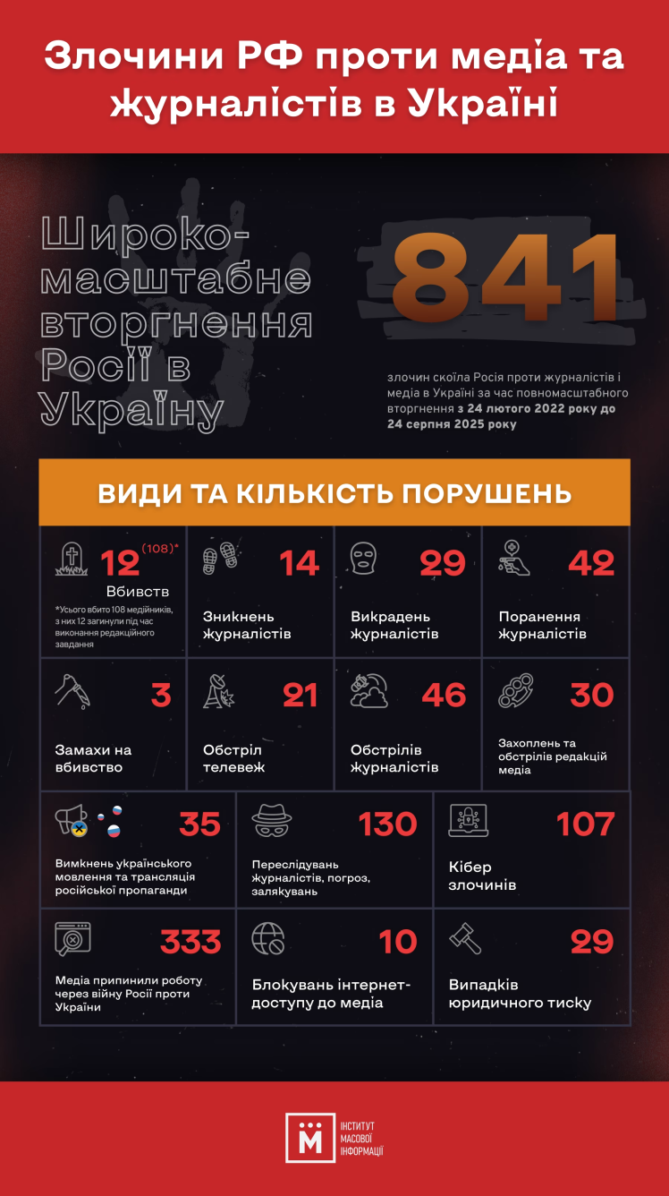 The day before, on August 24, the Institute of Mass Information wrote that in the three and a half years since the start of the full-scale invasion, Russia has committed 841 crimes against journalists and media in Ukraine.