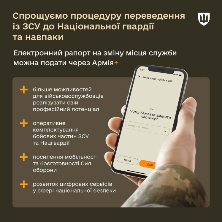In addition, the government has simplified the procedure for transferring from the Armed Forces of Ukraine to the National Guard and vice versa. Now an electronic report on a change of place of service can be submitted through the "Army+" application.