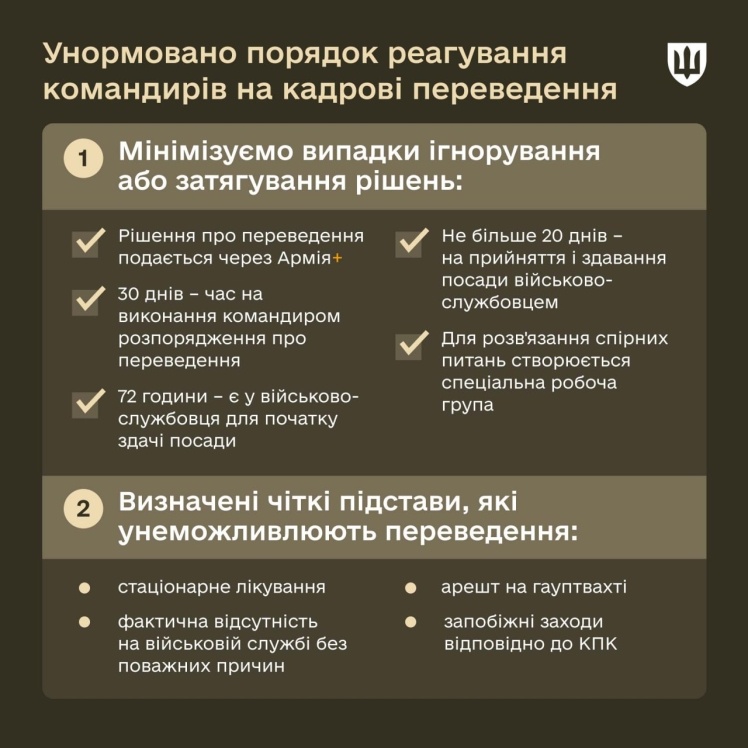 - The personnel center of the Armed Forces of Ukraine considers the commanderʼs substantiated requests to cancel the transfer within 5 days.