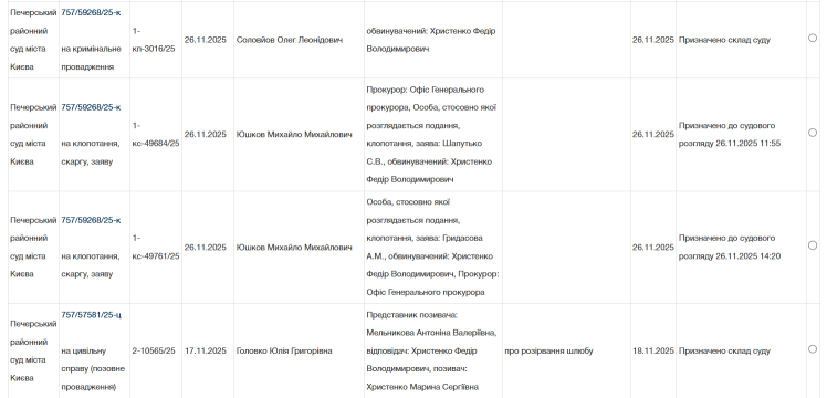 The portal Sudova Vlada also reports that on November 17, Khrystenkoʼs wife Yulia Holovko filed for divorce. If Khrystenkoʼs property and accounts are frozen, further division of property may allow his wife to lift the arrest on part of the property and avoid its confiscation in the future.