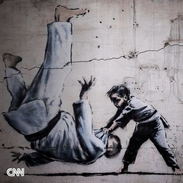 Another work shows a small boy dressed in a martial arts uniform throwing a grown man on his back — the man looks like Putin.