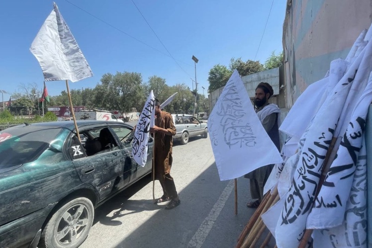 Taliban fighters in a US military Humvee vehicle in Kabul after the de facto seizure of power, August 31, 2021. Taliban flags are distributed outside the US embassy in Afghanistan, August 26, 2021. A transport plane departs from Kabul International Airport as hundreds of Afghans wait for possible evacuation to the United States, August 23, 2021.