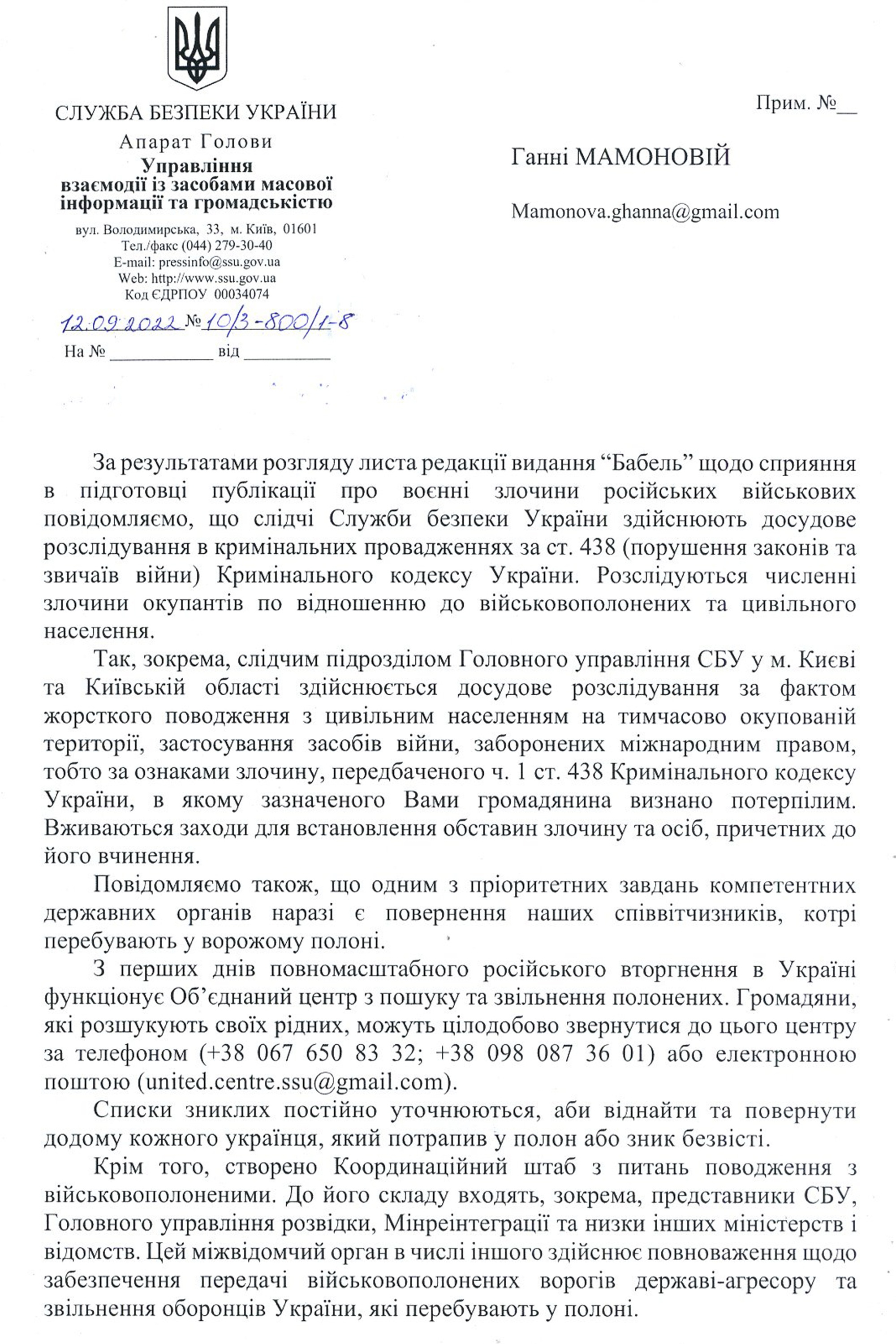 The Security Service of Ukraine and the Kyiv Regional Prosecutorʼs Office officially informed Babel that Savchuk was recognized as a victim in the case of brutal treatment of the civilian population and the use of means of war prohibited by international humanitarian law. The pre-trial investigation is conducted under Art. 438 of the Criminal Code of Ukraine “Violation of laws and customs of war”.