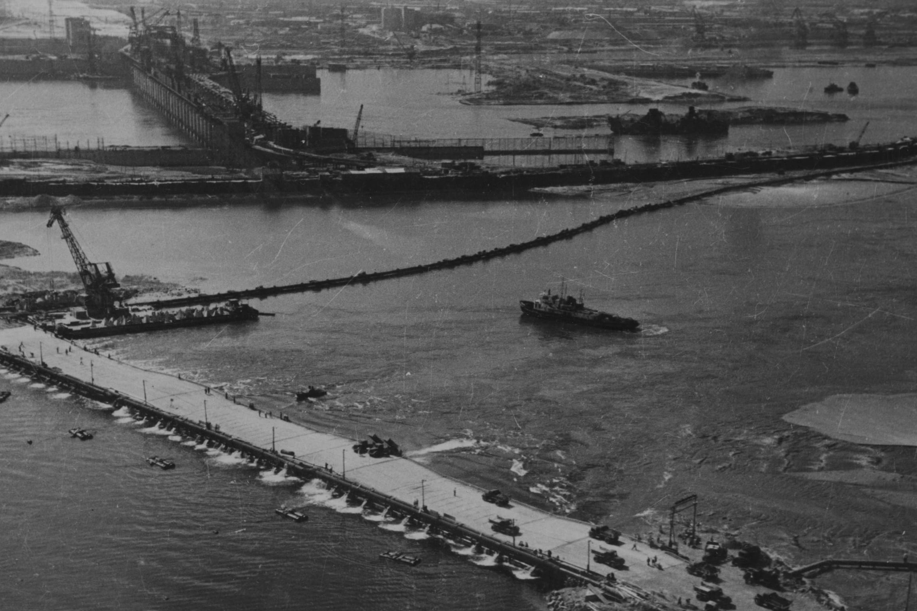 Concreting of the foundation part of the Kakhovka HPP dam, 1954. Locomotive under the construction of the Kakhovka HPP, 1954. A floating bridge for blocking the Dnipro River during the construction of Kakhovka HPP, 1955.