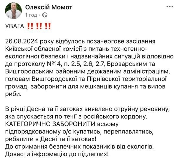 Сьогодні міський голова Вишгороду, що в Київській області, Олексій Момот повідомив на своїй сторінці у Facebook, що у річці Десні нібито виявили отруйну речовину, яка спускається течією з-під російського кордону.