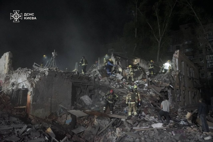 Найбільше від атаки постраждав Святошинський район — там загоряння сталися на шести локаціях, є руйнування. Триває розбір завалів зруйнованого будинку. Із-під руїн чути телефонні дзвінки.