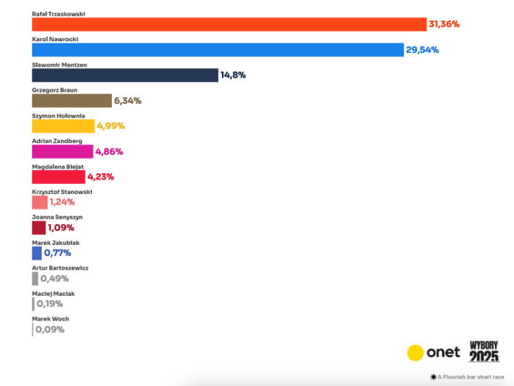 Отже, до другого туру президентських виборів у Польщі проходять проєвропейський мер Варшави Тшасковський та історик, очільник польського Інституту національної памʼяті Навроцький. Другий тур запланований на 1 червня.