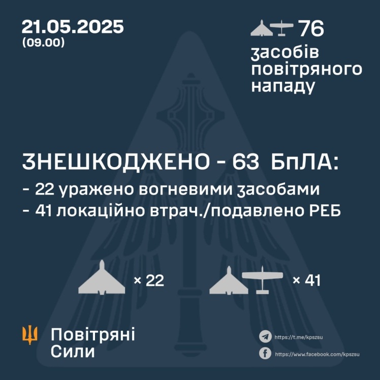 У ніч на 21 травня Сили ППО в небі над Україною знешкодили 63 російські безпілотники. З них 22 збили, а ще 41 подавили засобами РЕБ.