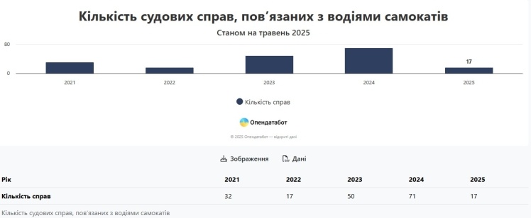 Це на 42% більше, ніж у 2023 році — тоді справ було 50. А за перші пʼять місяців 2025 року порушили 17 справ, де фігурують електросамокати.