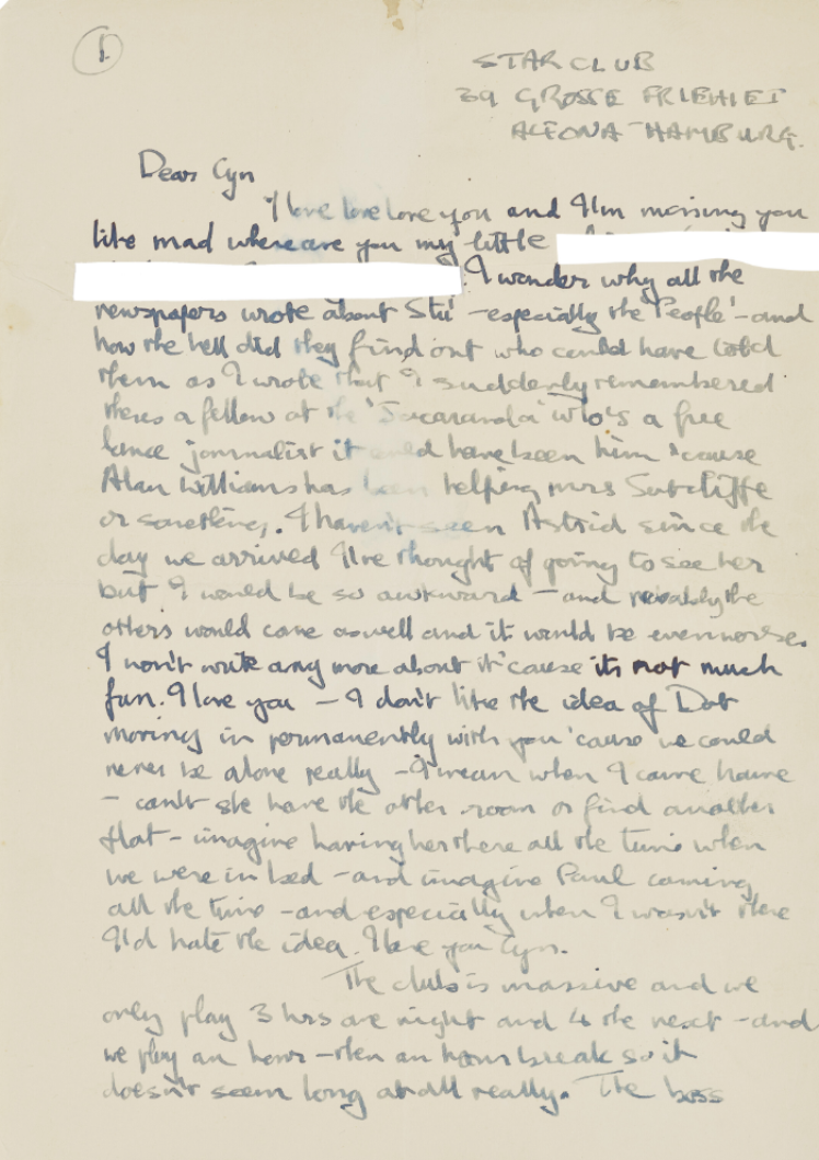 У листі — чотири сторінки. Леннон написав його у квітні 1962 року. Тоді музиканту був 21 рік, він кілька ночей виступав у Гамбурзі, де тоді ще непопулярні The Beatles давали серію щоденних концертів у клубі Star-Club. Загалом це потік свідомості Леннона, який рясніє зізнаннями в коханні Синтії.