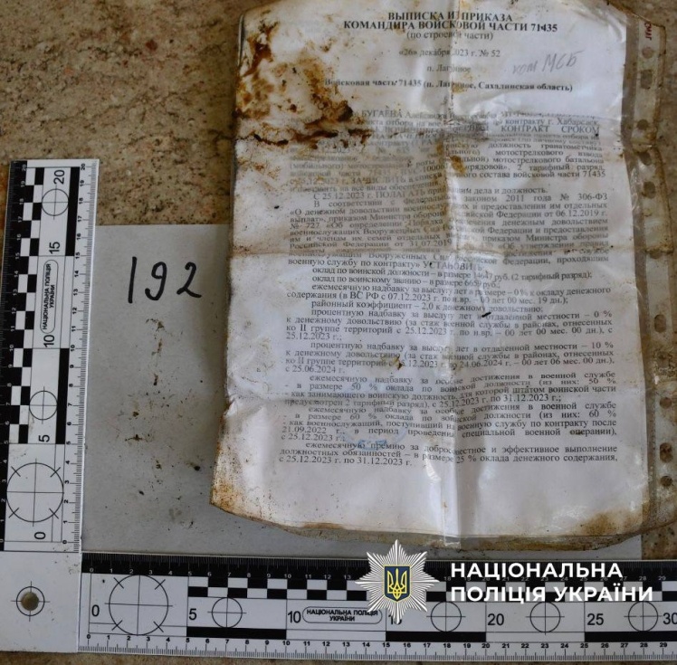 Серед переданих було тіло № 192/25. На ньому — форма зразка ЗС РФ, а при ньому — російські паспорт, військовий квиток, талон атестату військовослужбовця № 1252, виписки з наказу командира в/ч № 52 від 26.12.2023, жетон з написом: «ВС РОССИИ МТ-146004».