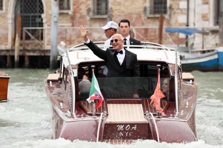 Безос і Санчес у водному таксі біля готелю Aman, 26 червня 2025 року.