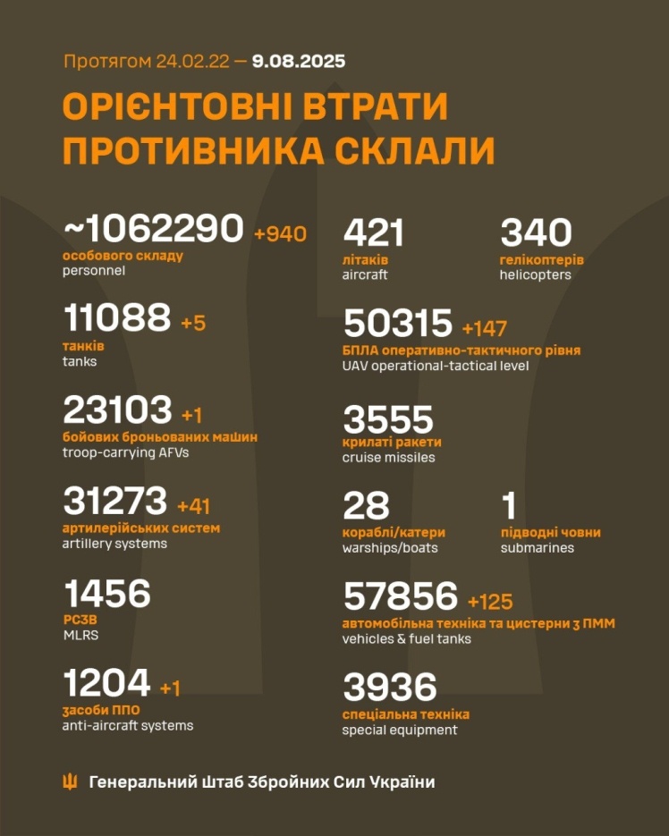 Упродовж минулої доби, 8 серпня, російська армія втратила в Україні ще 940 своїх військовослужбовців убитими й пораненими, а також десятки одиниць техніки.