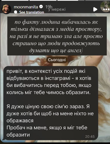 Moonmanita виклала в інстаграм-сторіз виклала скриншот, як Темляк особисто вибачився перед нею.