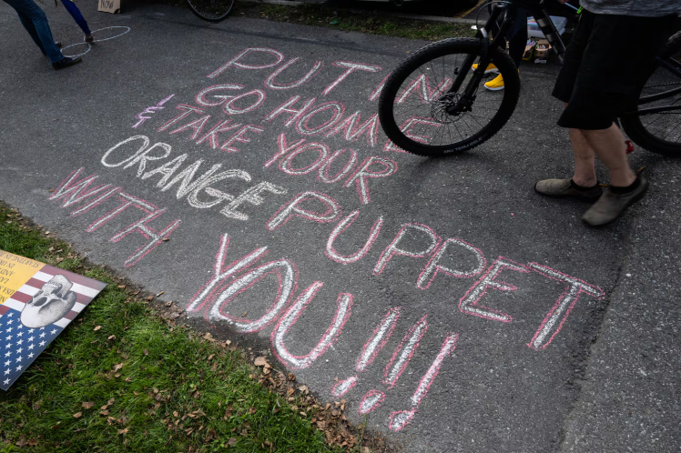 «Я бачу фашистів з мого будинку», — було написано на одному з плакатів, пародіюючи нині популярне зауваження 2008 року колишньої губернаторки Сари Пейлін про близькість Аляски до Росії.