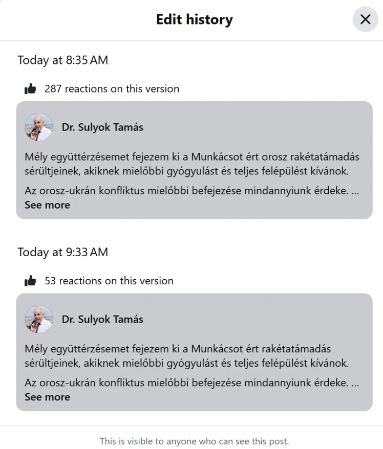 Президент Угорщини Тамаш Шуйок у дописі у фейсбуку висловив співчуття постраждалим внаслідок російської атаки на Мукачево. Проте менш ніж за годину він відредагував пост: замість «російського ракетного удару» у дописі тепер написано просто «ракетний удар».