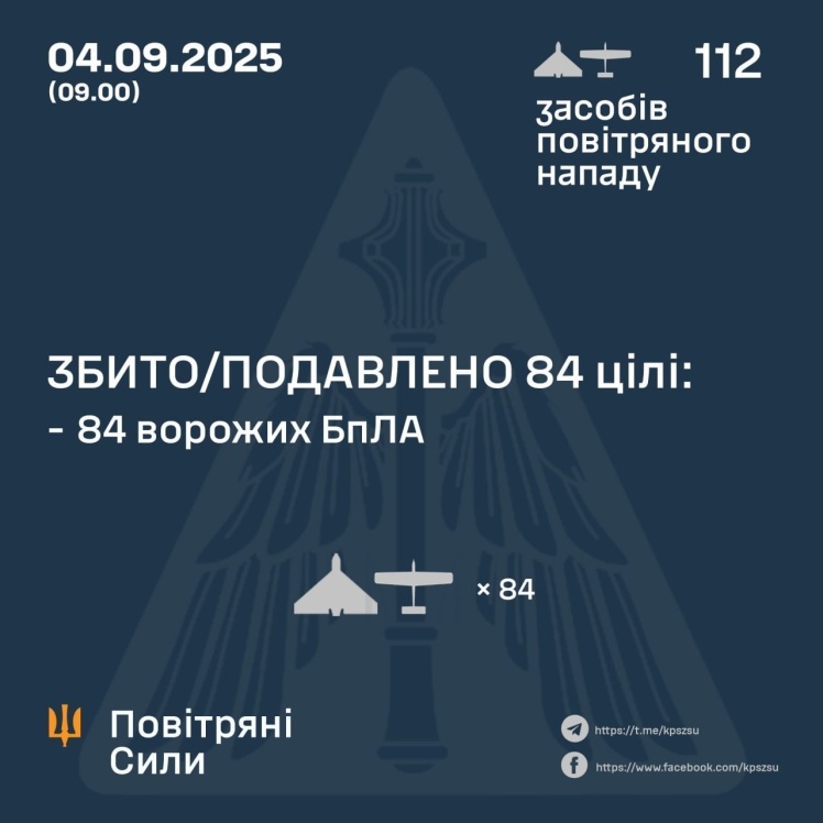 У ніч проти 4 вересня російська армія запустила по Україні 112 ударних БпЛА типу Shahed і безпілотників-імітаторів різних типів.