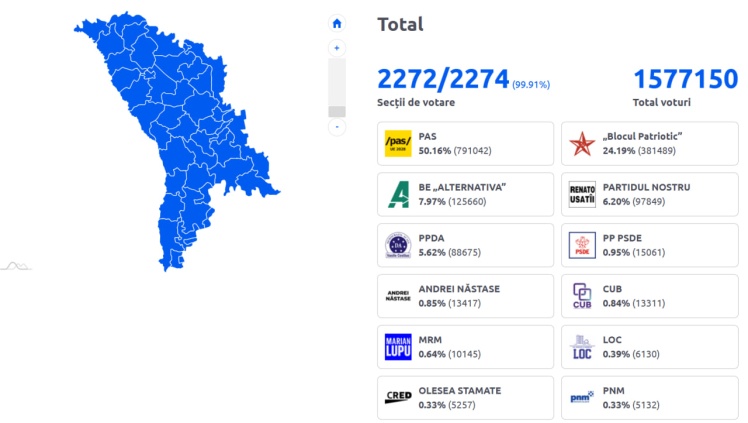Друге місце посідає опозиційний «Патріотичний виборчий блок», одним з лідерів якого є колишній проросійський президент Ігор Додон. Блок набрав 24,31% голосів.