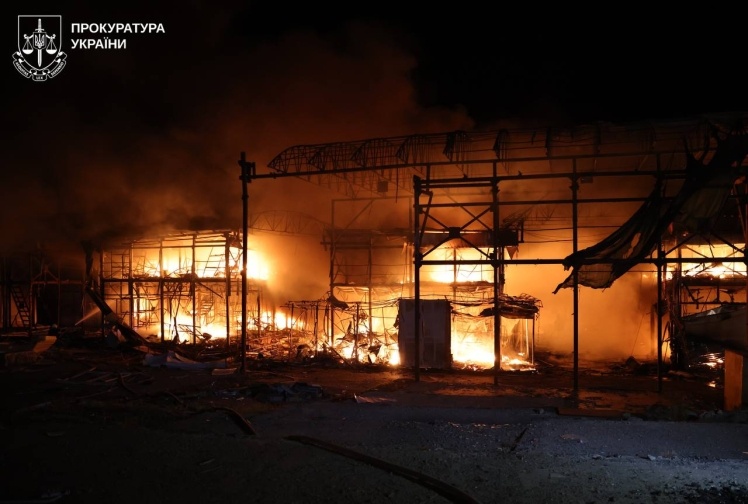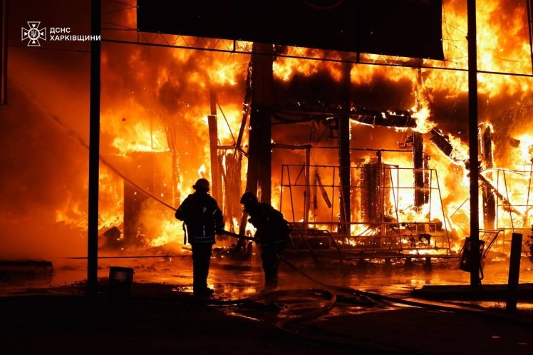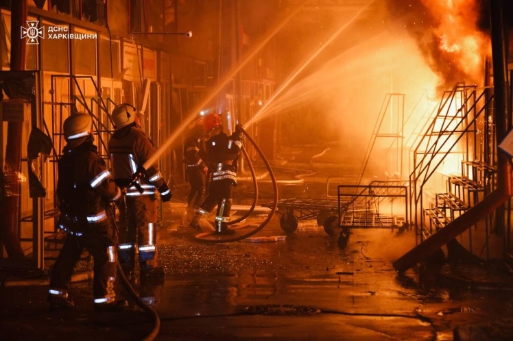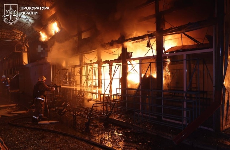 У Київському районі під ударом опинився торговельний центр, загорілися павільйони біля станції метро «Барабашова», пошкоджено вхід до метро.