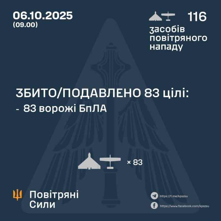 Українська ППО знешкодила 83 ворожих БпЛА на півночі, півдні, сході та центрі країни.