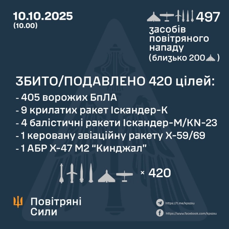 Повітряні сили звітують, що українська ППО знешкодила 420 повітряних цілей із 497, а саме: