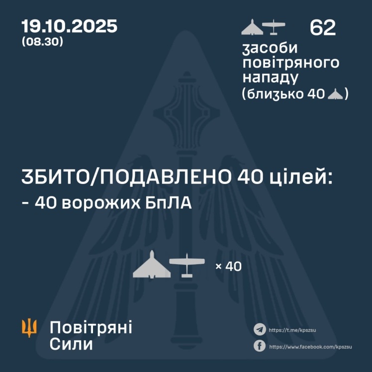 У ніч проти 19 жовтня російська армія атакувала Україну 62 ударними БпЛА типу Shahed, «Гербера» і безпілотниками інших типів.
