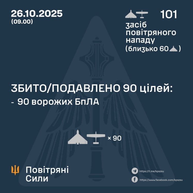 У ніч проти 26 жовтня російська армія запустила по Україні 101 ударний БпЛА типу Shahed, «Гербера» та інших типів. Близько 60 з них — Shahed.