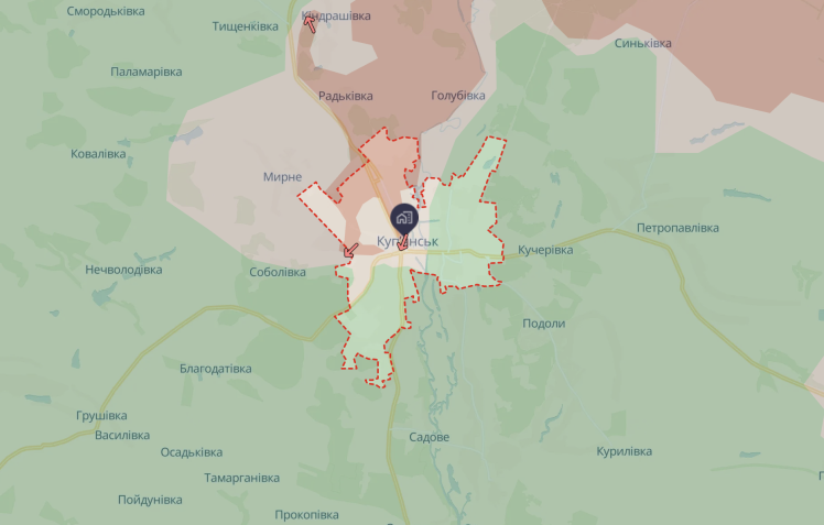Аналітичний сервіс DeepState на своїй мапі зображає, що північно-західна частина Купʼянська перебуває під контролем росіян.