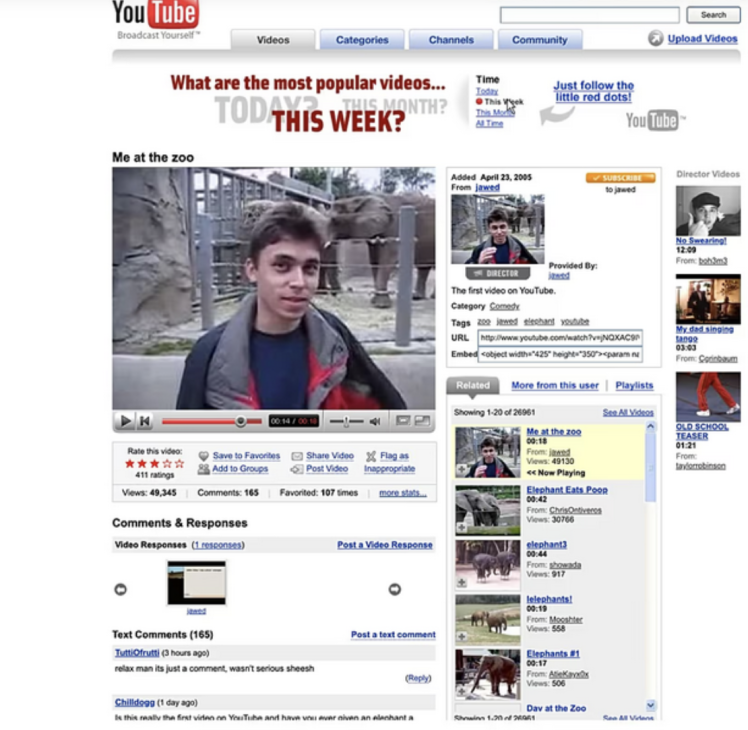 До музею потрапило 19-секундне відео Me at the zoo, у якому 25-річний співзасновник YouTube Джавед Карім розповідає про слонів. Цей ролик, знятий на цифрову камеру низької роздільної здатності, став поворотним моментом у розвитку користувацького контенту в інтернеті.