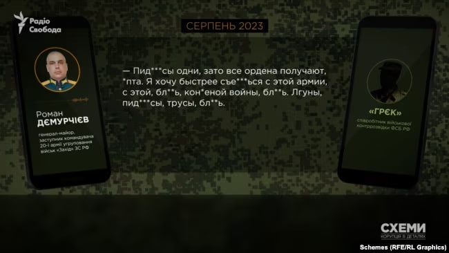 «П*дараси лише навколо, зате всі ордени отримують. Я хочу швидше з*батися з цієї кінченої війни. Брехуни, п*дараси та боягузи», — розповідав Демурчієв співрозмовнику, підписаному як «Грек». Журналісти встановили, що це співробітник військової контррозвідки ФСБ на ім’я Роман.