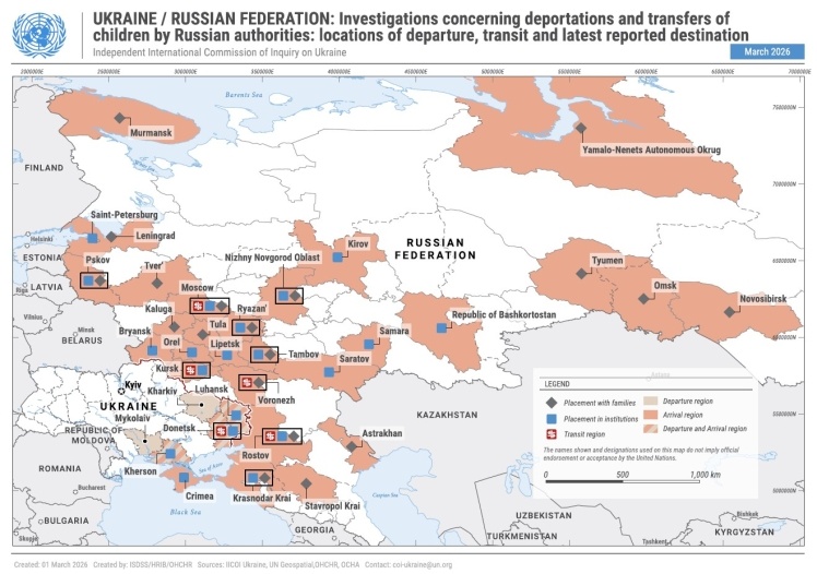 Міжнародне право дозволяє евакуацію лише тимчасово і з поважних причин. Однак більшість депортацій і переміщень дітей, які розслідувала комісія, не були тимчасовими. Навпаки, російська влада на найвищих рівнях уряду координувала дії, щоб забезпечити довгострокове розміщення дітей у РФ. Спочатку їх перевозили до тимчасових транзитних центрів у Росії або на окупованих територіях, потім поступово депортували до різних місць у 21 регіоні Росії.