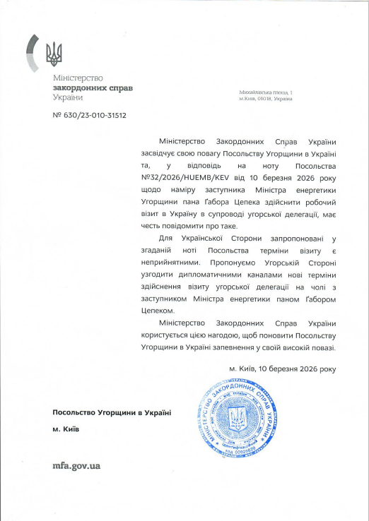 Джерела в дипломатичних колах передали «Бабелю» ноту, яку МЗС України надіслало у відповідь, з неї випливає, що домовленості про візит делегації Україна і Угорщина не досягли. У ноті йдеться, що Україні не підходять запропоновані терміни візиту, а МЗС України пропонує узгодити нові терміни.