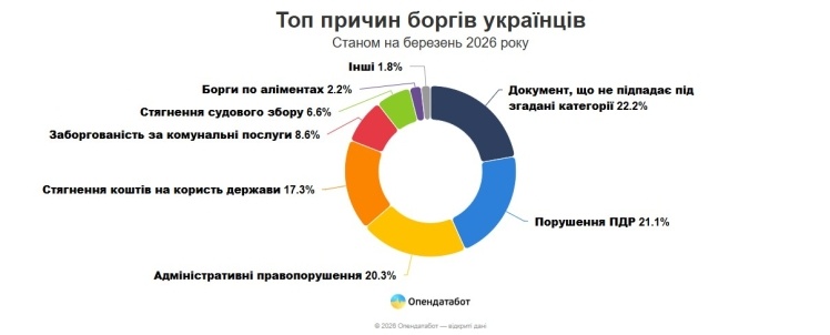 Серед конкретних категорій найбільше боргів з’явилось через штрафи за порушення правил дорожнього руху — понад 2 млн проваджень (21%). Ще 20% становлять інші адміністративні правопорушення, а понад 8% — борги за комуналку.