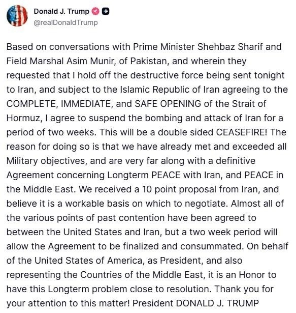 Президент США Дональд Трамп написав у Truth Social, що погодився на два тижні припинити вогонь з Іраном — це буде двостороннє припинення вогню. За його словами, США погодились на це тому що здобули та перевищили всі свої воєнні цілі.