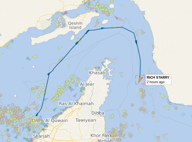 Як пише Bloomberg, Rich Starry вже вдруге за менш ніж 24 години намагається пройти протоку. Після початку блокади судно спершу зайшло у вузький прохід біля острова Кешм, але розвернулося, а згодом відновило рух і знову рушило на вихід із Перської затоки.
