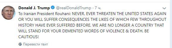 «Президенту Ірану Роухані: ніколи, ніколи не погрожуйте США, або ви постраждаєте від таких наслідків, від яких мало хто страждав в історії. Ми більше не та країна, яка буде терпіти ваші божевільні слова про жорстокості і смерті. Будьте обережні!» — заявив Трамп.