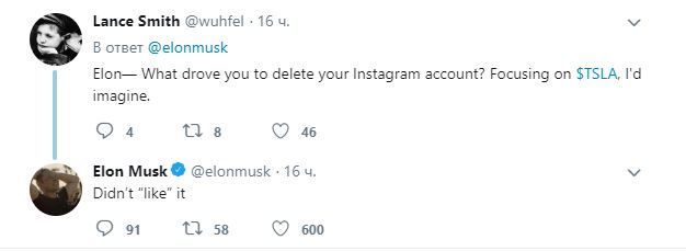 Один з фоловерів поцікавився, чому Маск видалив свій Instagram. «Вирішив зосередитися на роботі в Tesla?» — запитав він.
