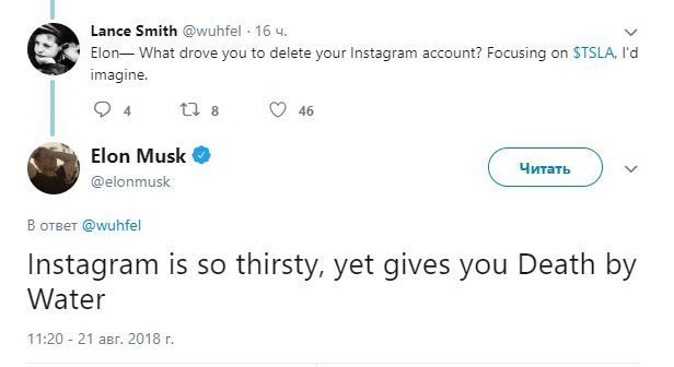 «Instagram викликає спрагу, але при цьому вбиває водою», — пояснив Маск в наступному повідомленні.