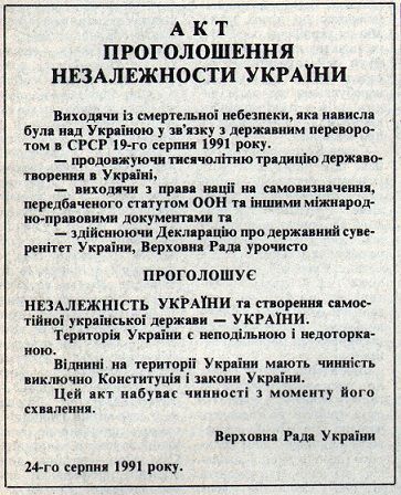 У преамбулі до документу говорилося, що приймається він «виходячи із смертельної небезпеки, яка нависла була над Україною в звʼязку з державним переворотом в СРСР 19 серпня 1991 року», «продовжуючи тисячолітню традицію державотворення», «виходячи з права на самовизначення» і «здійснюючи Декларацію про державний суверенітет України».