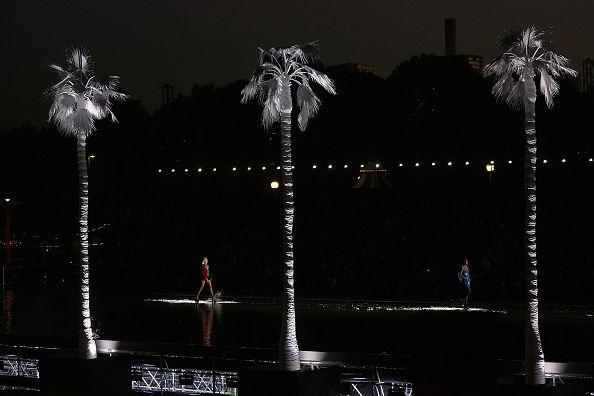 Дизайнер Сен-Лоран влаштував дефіле біля підніжжя Ейфелевої вежі, а моделі йшли залитим водою подіумом уздовж підсвічених пальм. У колекції дизайнера багато мережива, блискучих суконь, шкіри та стразів.
