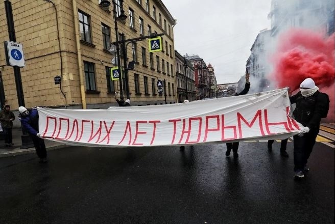 У Санкт-Петербурзі люди вийшли на акцію і розтягнули на вулиці Повстання банер з написом «Довгих років вʼязниці». Активісти перекрили вулицю Повстання і запалили фаєри.