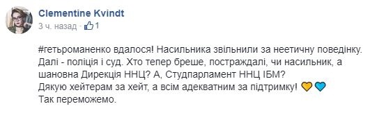 «Насильника звільнили за неетичну поведінку. Далі — поліція і суд. Хто тепер бреше, постраждалі, або насильник», — написала вона спочатку, але потім замінила слово «насильник» на прізвище викладача.