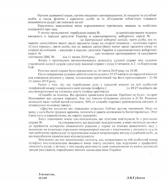 Суддя Шостого апеляційного адміністративного суду Людмила Губська заявила, що їй надіслали вдячні SMS і обіцяли матеріальну винагороду за рішення на користь кандидата від партії «Слуга народу» Олександра Куницького.
