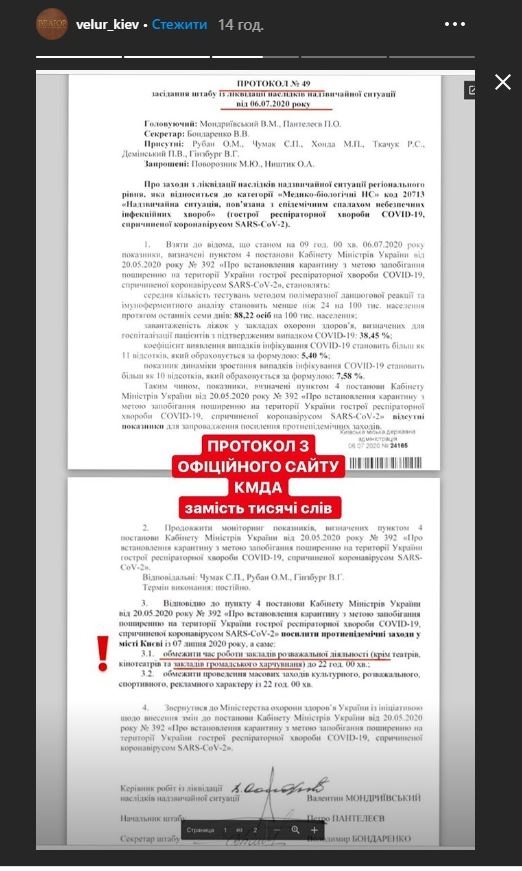 Пізніше «Велюр» в Instagram знову опублікував сторіс, де виклав скріншот протоколу Київської міськдержадміністрації від 6 липня. У ньому йшлося, що ресторанам і барам дозволялося працювати після 22:00, але Кабінет міністрів 8 липня видав нову постанову, яка забороняє працювати закладам громадського харчування після цього часу. «Велюр» послався на старий документ.
